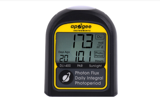 DLI-400測量儀有兩種不同的屏幕模式:存儲數據和實時查看數據。在存儲數據屏幕中,它顯示DLI測量值、光照時間和采集數據的日期(最多99天以前)。實時查看數據屏幕顯示過去2.5秒內PPFD的運行平均值。
