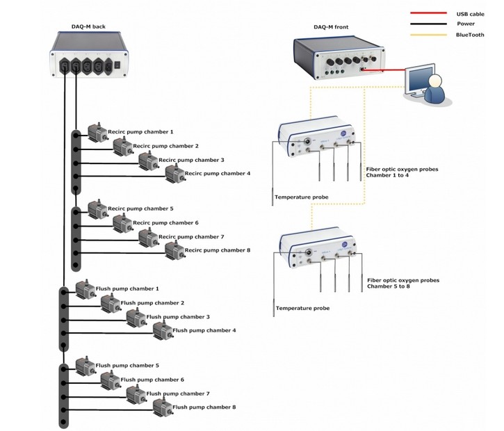 該系統(tǒng)基于光纖傳感技術(shù),由軟件和硬件設(shè)備組成,能在八個(gè)任意大小、形狀、體積的呼吸室里自動測量動物對氧的消耗率。還可兼容測量水溫的設(shè)備以及實(shí)時(shí)補(bǔ)償氧氣值軟件。需要針對實(shí)驗(yàn)動物對象配備合適的試驗(yàn)呼吸室chambers,以及匹配的8個(gè)光纖袖珍氧氣傳感器。